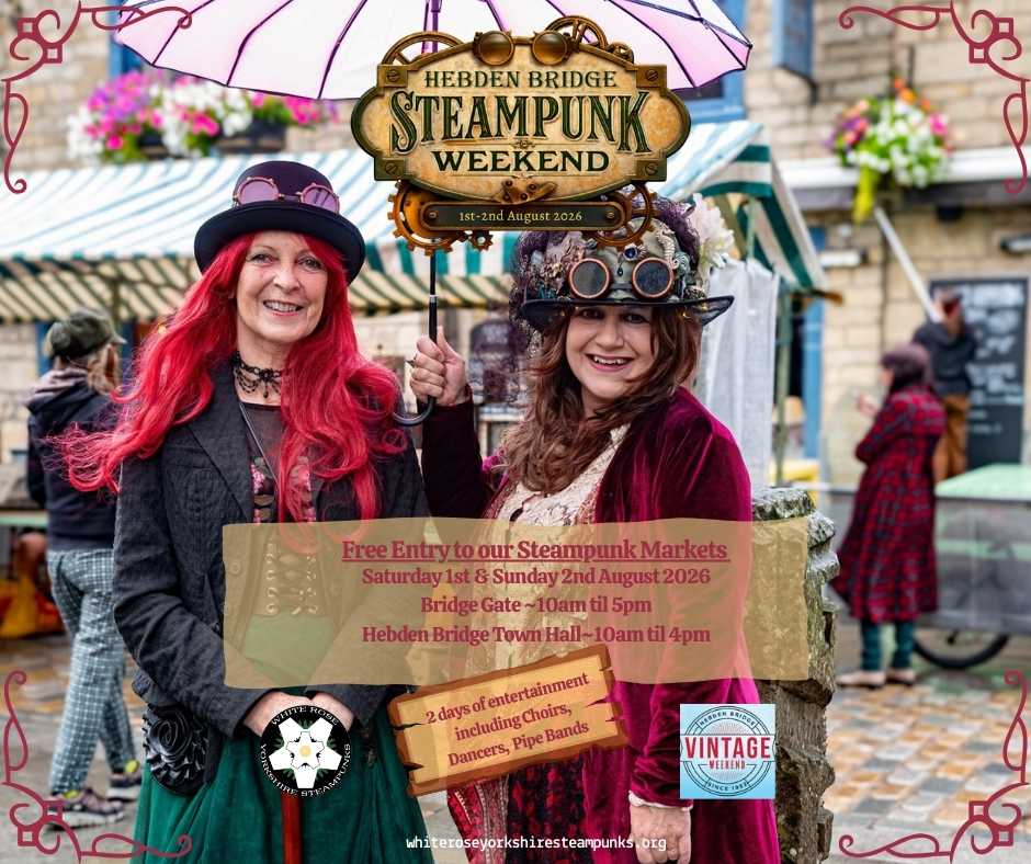 “Thank you for coming to the Hebden Bridge Steampunk Weekend 2025. It was a spectacular weekend, even though the weather was a little mixed. Thank you to our dancers, 400 Roses on Saturday and North Wind Tribal on Sunday. Thank you to Hebden Bridge Vintage Weekend for the opportunity to run the event alongside theirs.